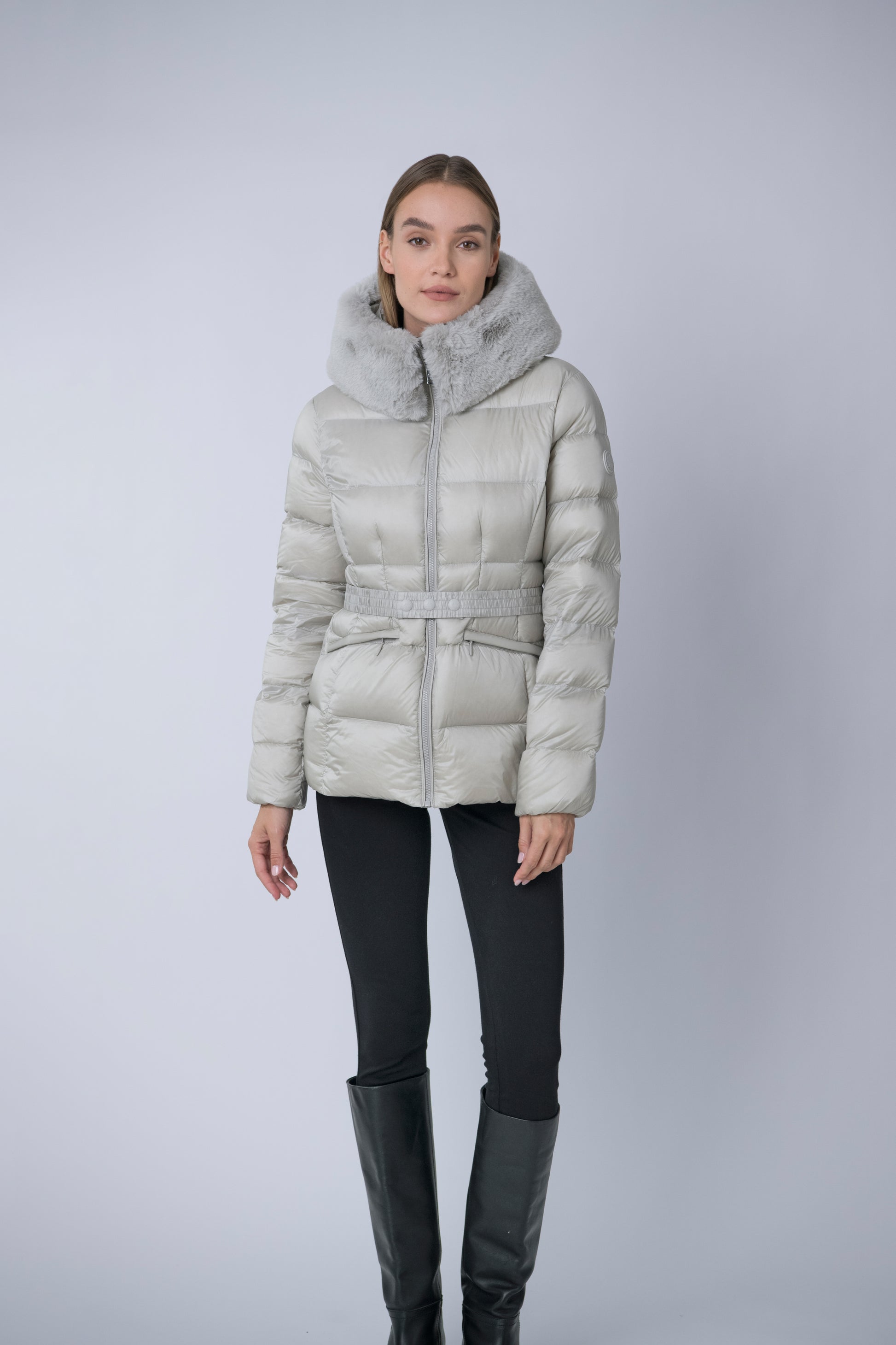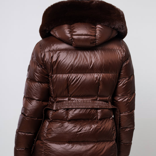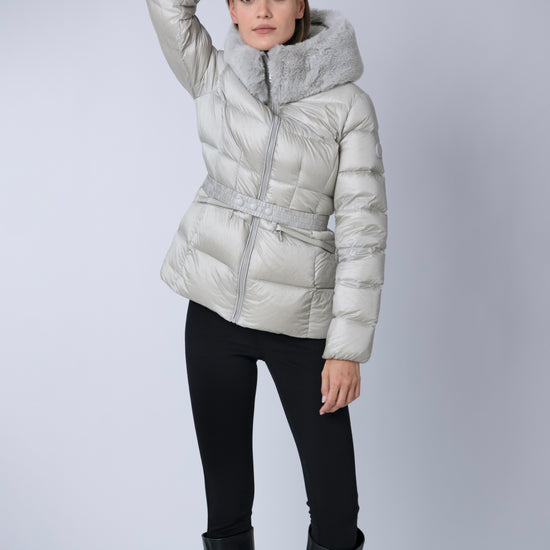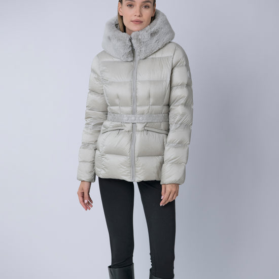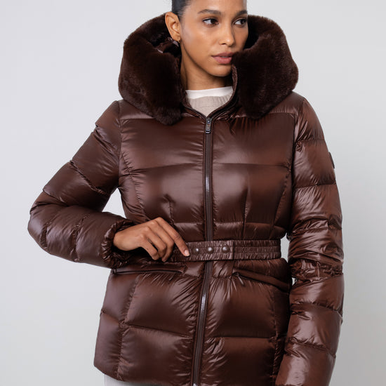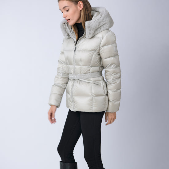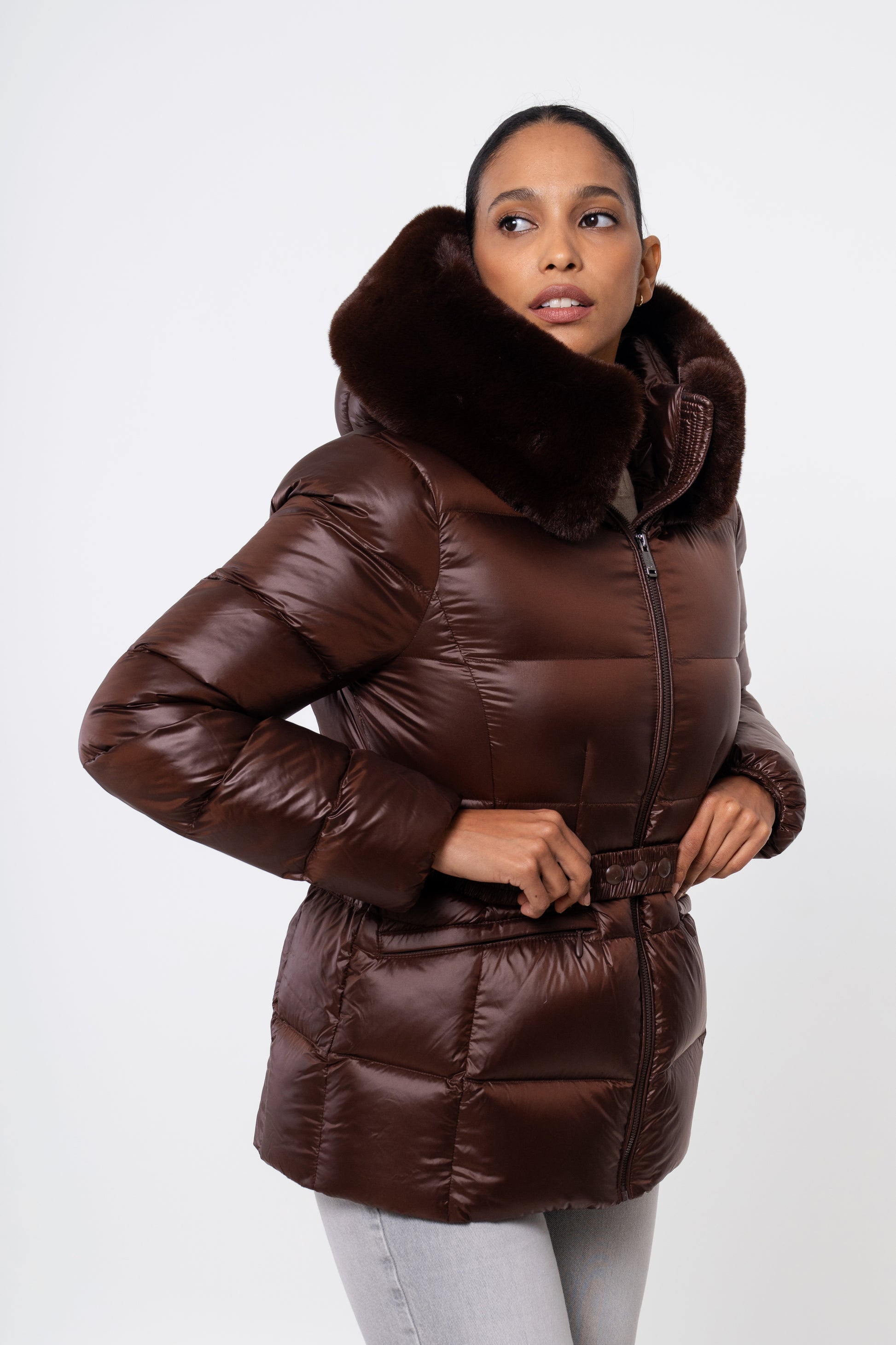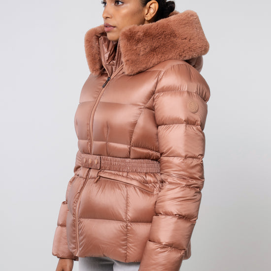 The versatile faux fur trimmed hood adds a touch of luxury, and the adjustable belt accentuates your silhouette. Embrace sustainable style without compromising on comfort or aesthetics.