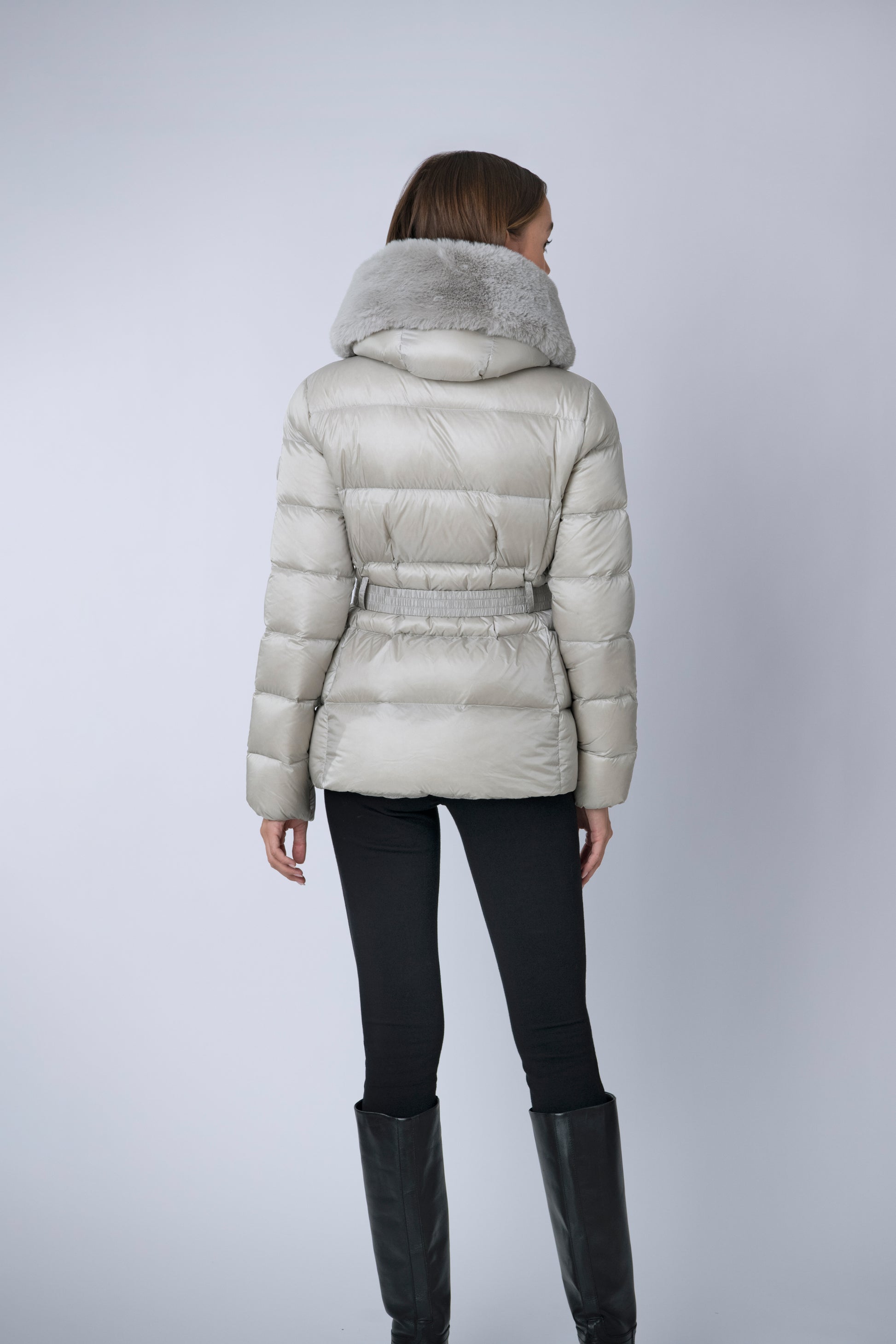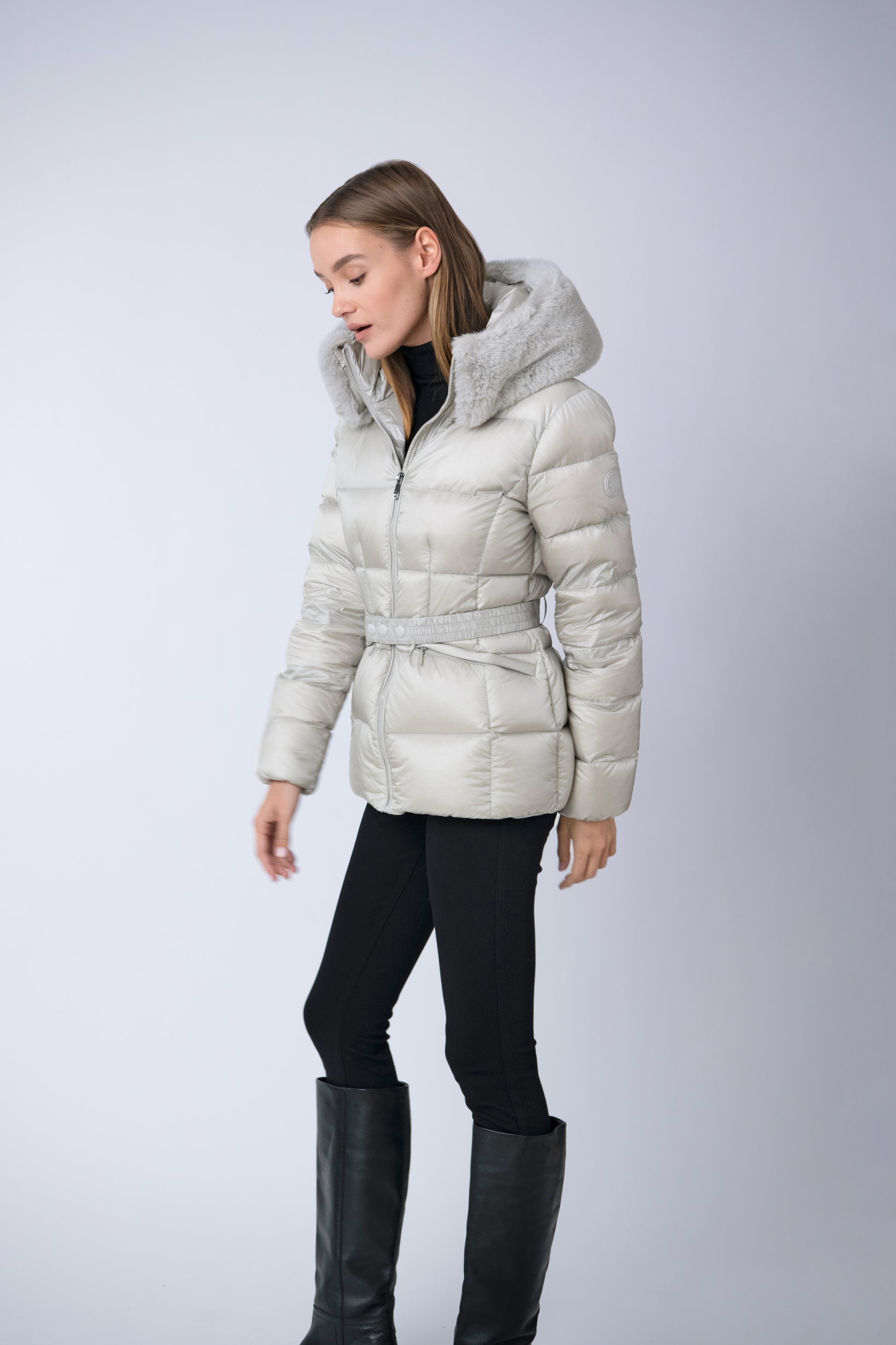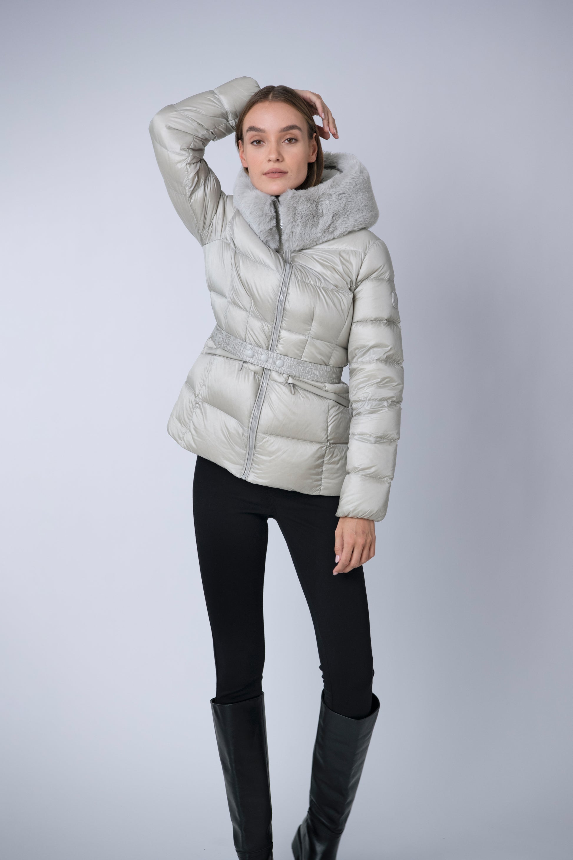 The versatile faux fur trimmed hood adds a touch of luxury, and the adjustable belt accentuates your silhouette. Embrace sustainable style without compromising on comfort or aesthetics.