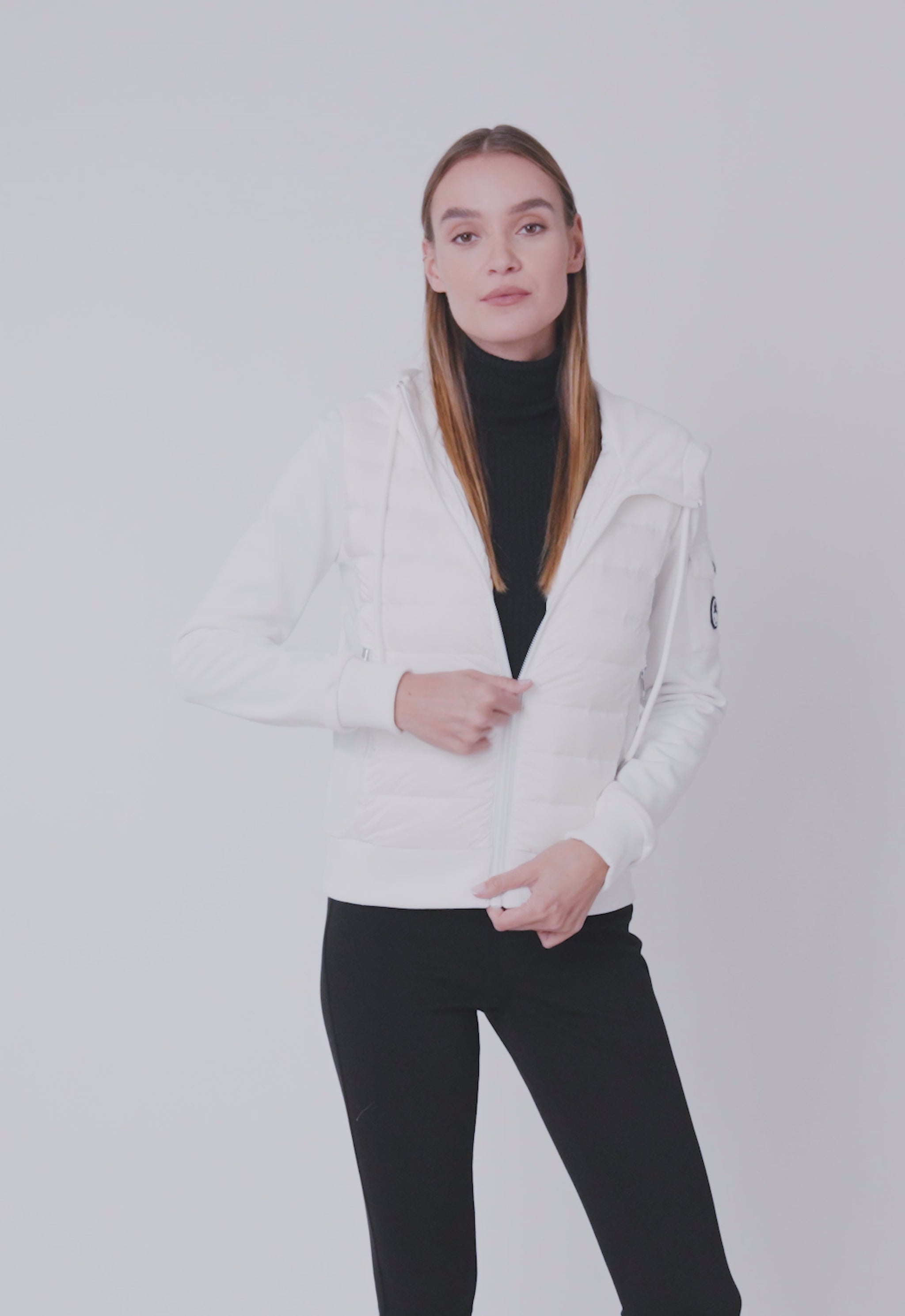 This recycled stretch pique knit and repurposed down filled hoodie is the ultimate in comfort and versatility. Great for layering under a recycled waterproof shell or wearing it with jeans and skids when hanging out. Fun, fashion, and function all in one.