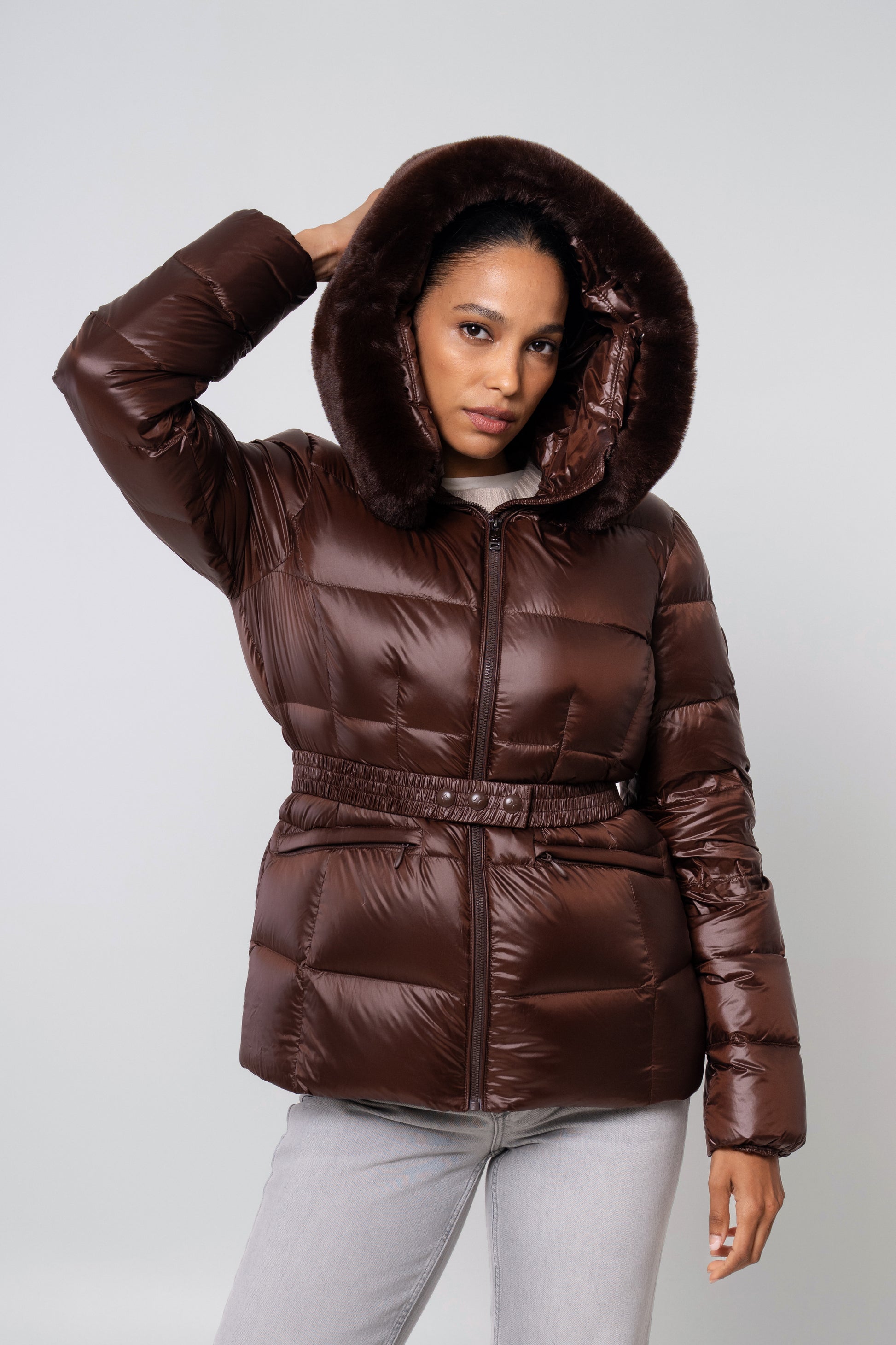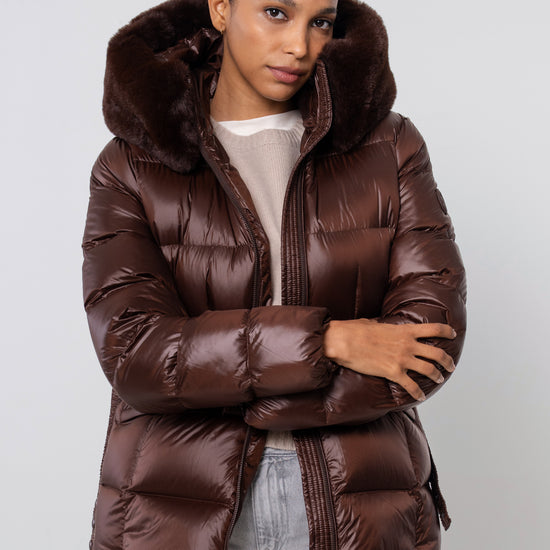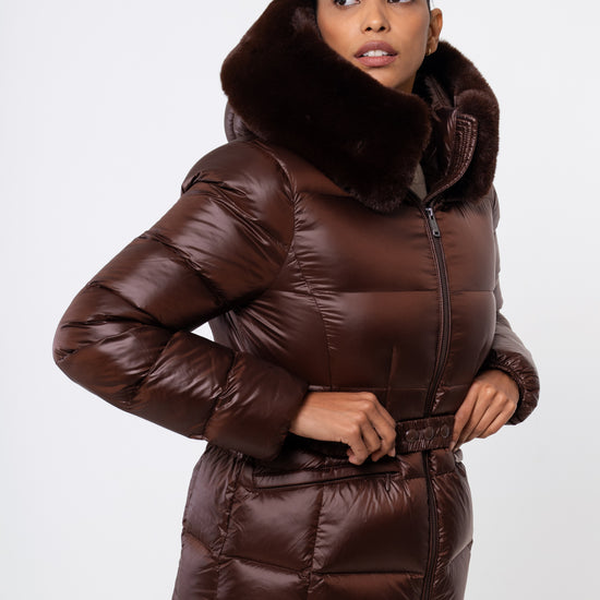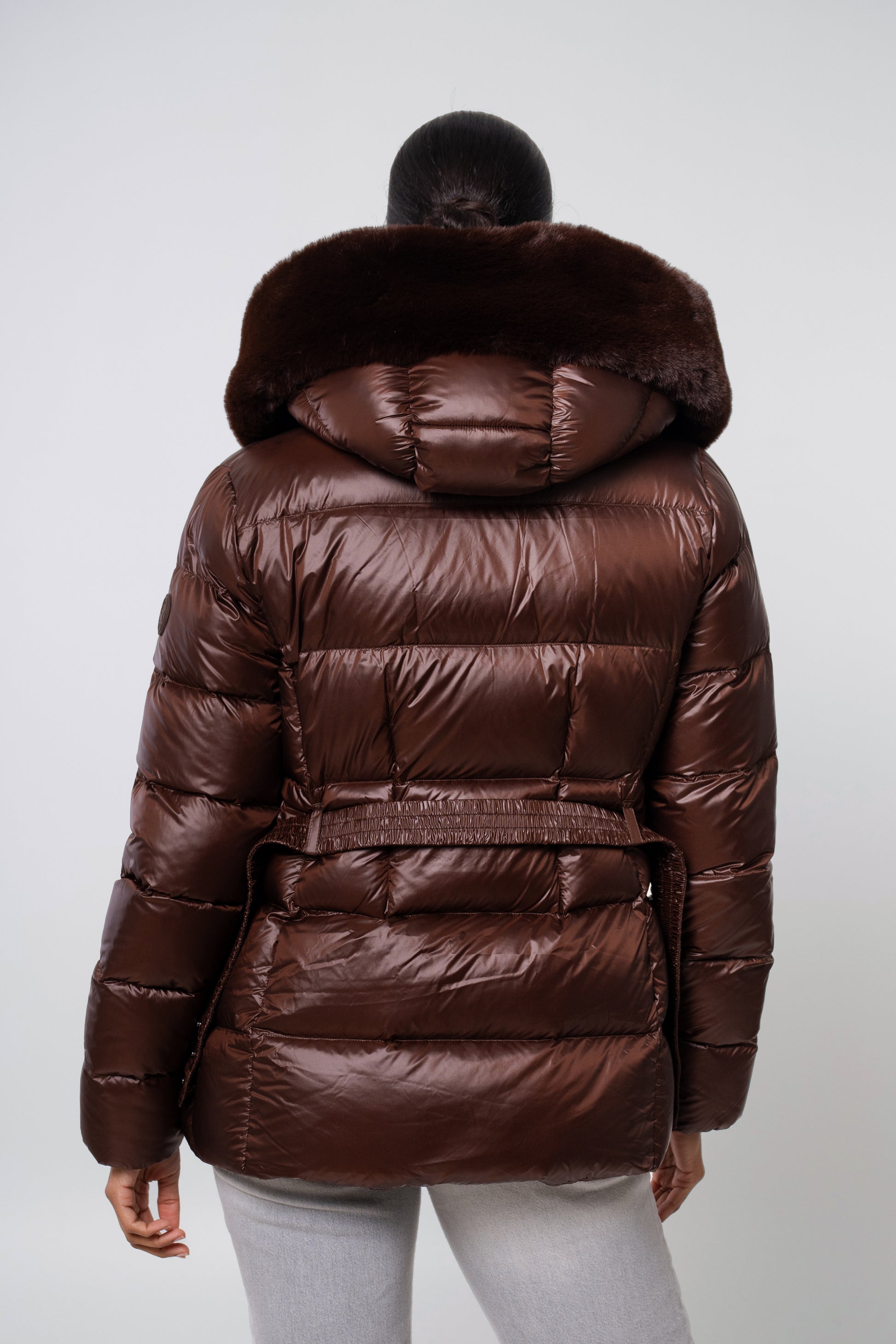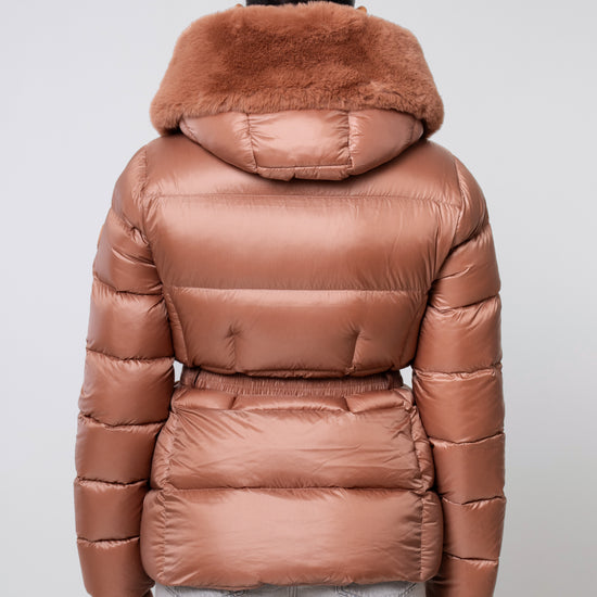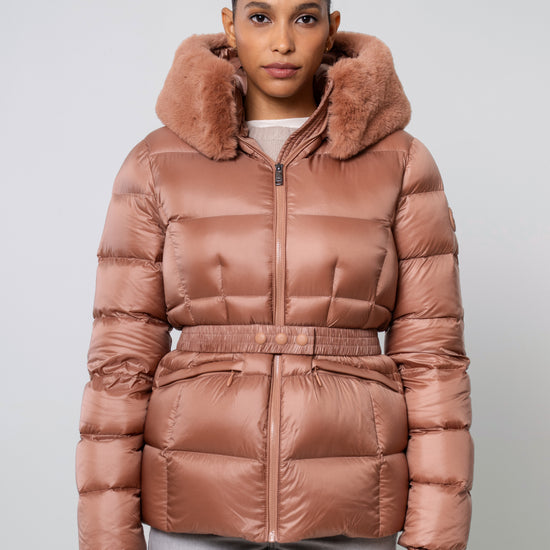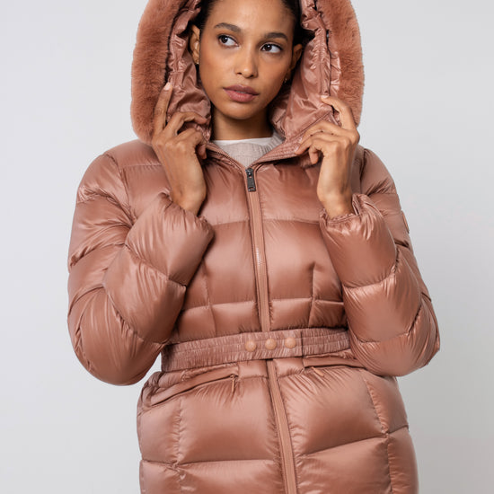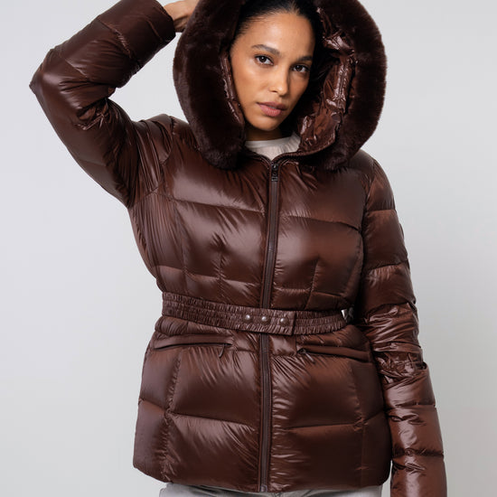The versatile faux fur trimmed hood adds a touch of luxury, and the adjustable belt accentuates your silhouette. Embrace sustainable style without compromising on comfort or aesthetics.