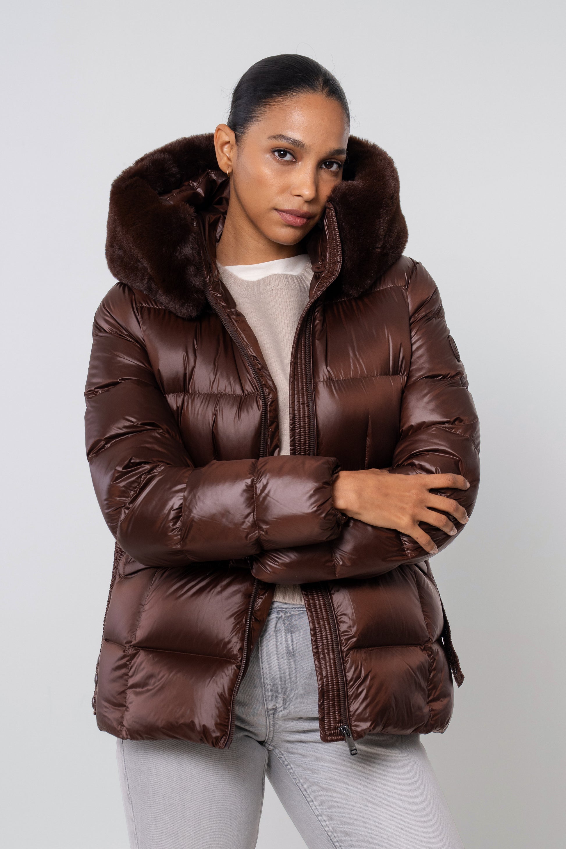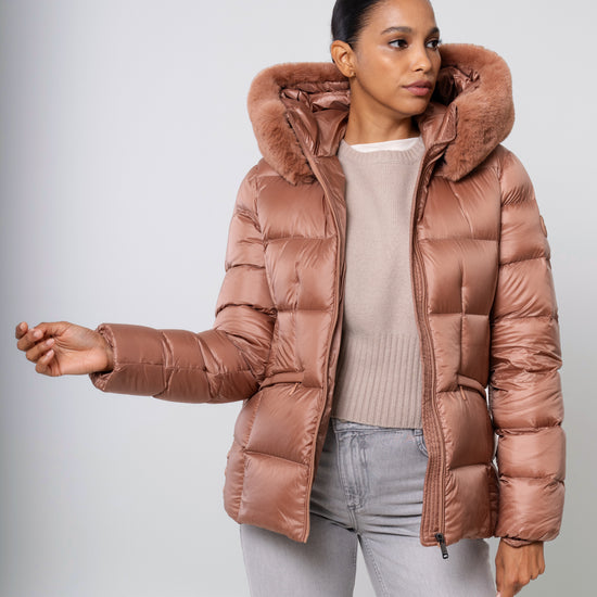 - Hood: Equipped with a recycled and removable faux fur trimmed insulated hood, which can be styled as a fur-wrapped collar or a fur-trimmed hood for versatility.