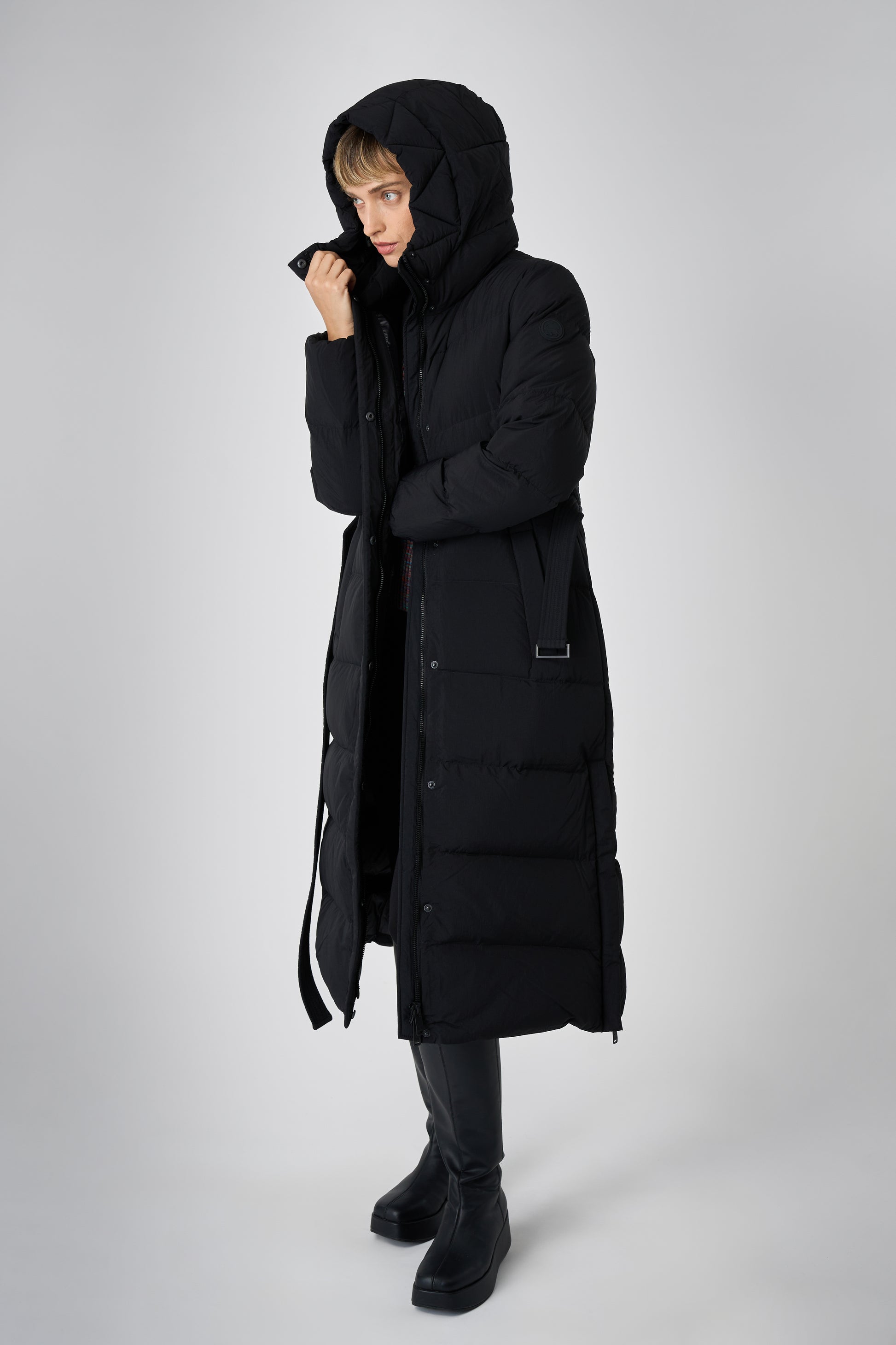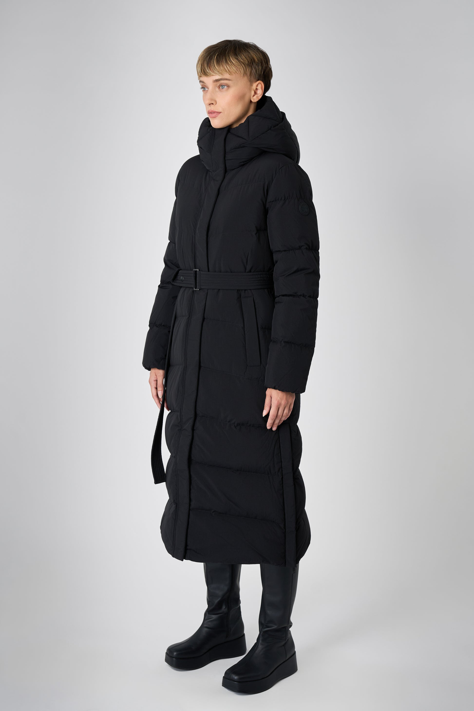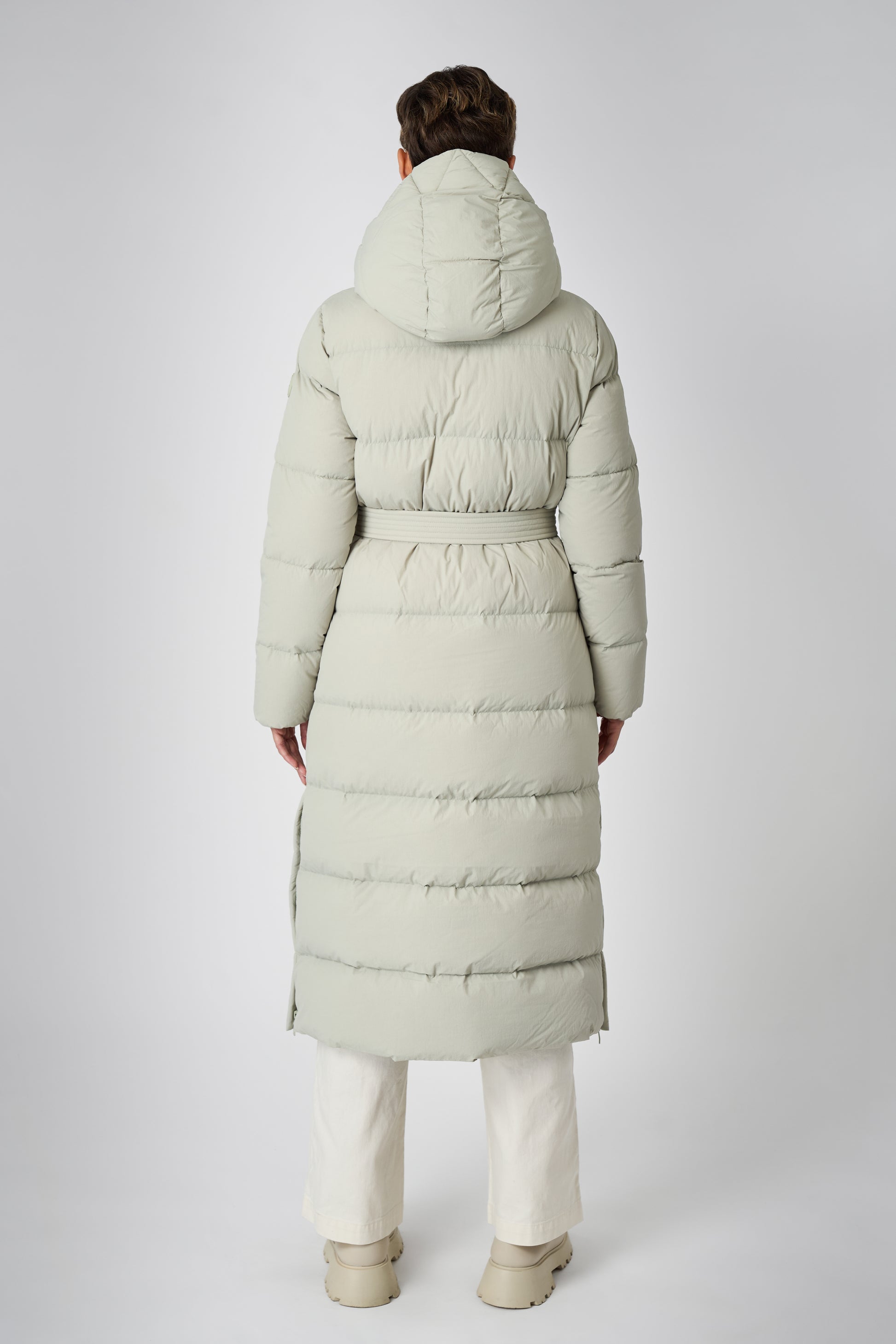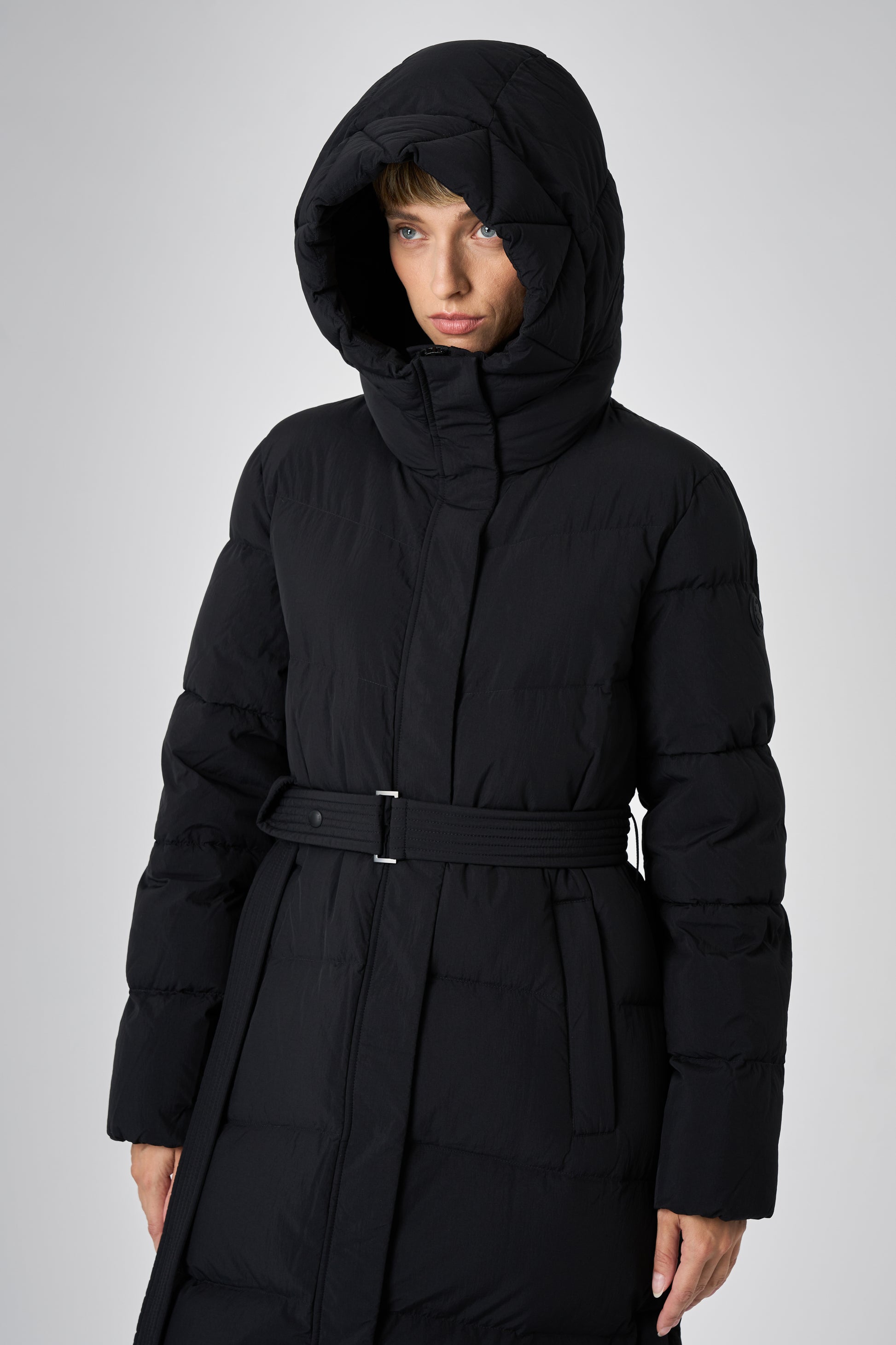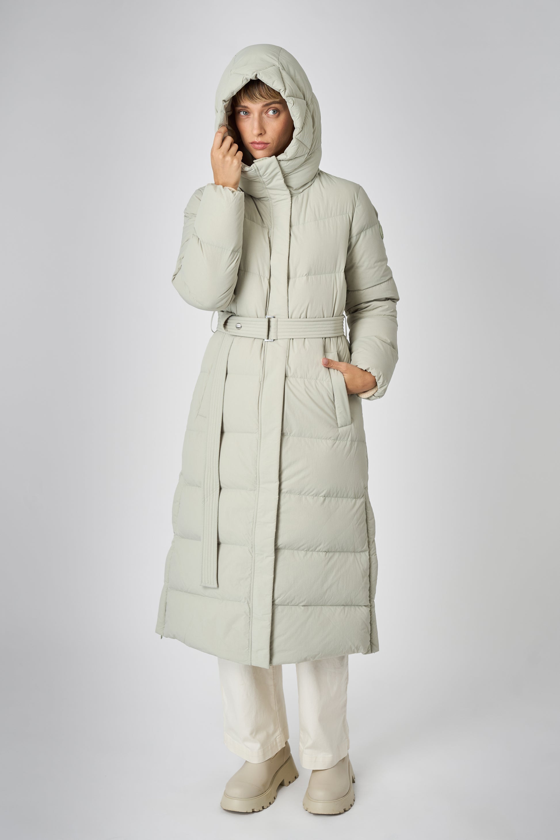 This long women's winter coat is designed for cold weather protection with repurposed down insulation for warmth in freezing temperatures. The belted silhouette and recycled materials make it both stylish and sustainable.