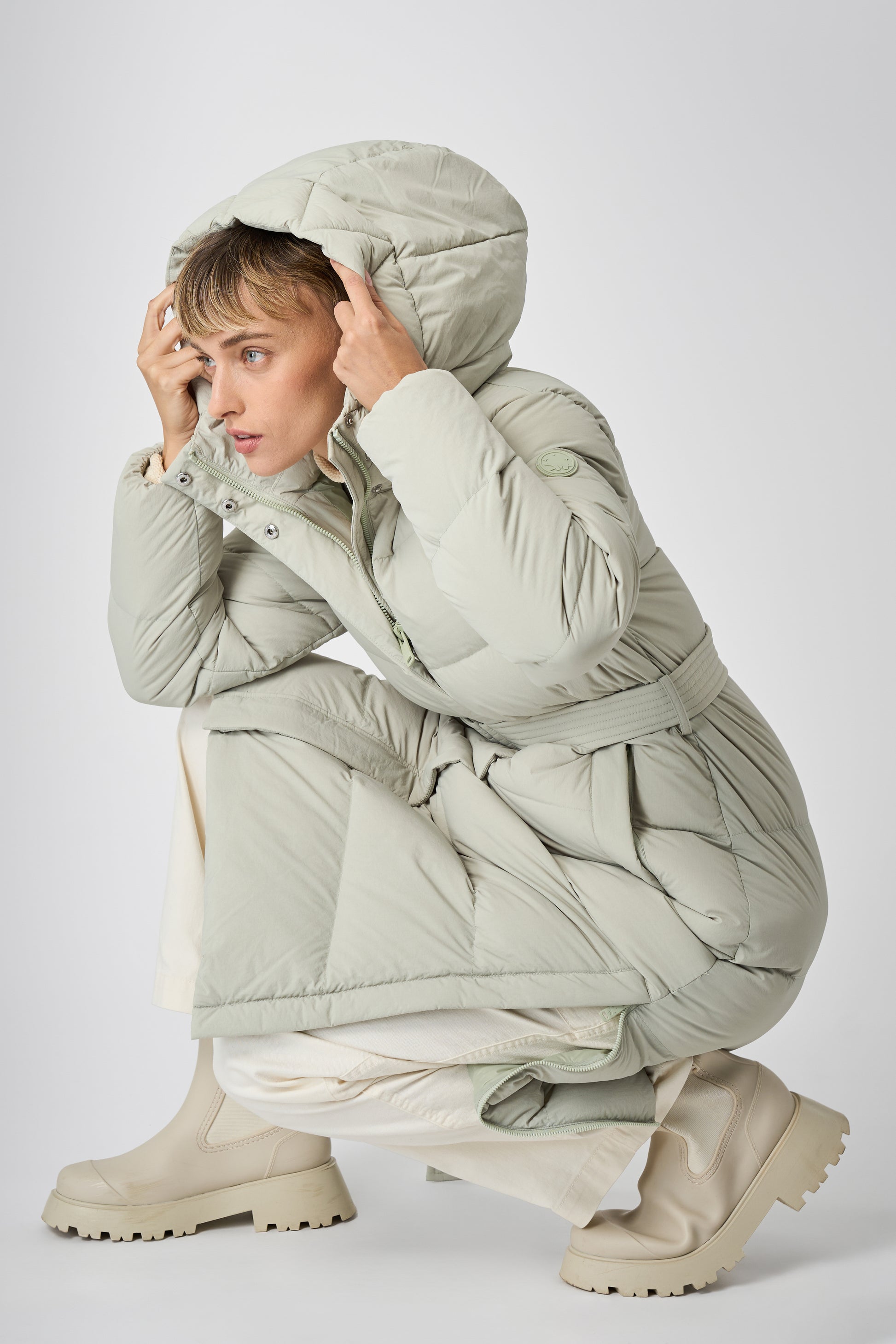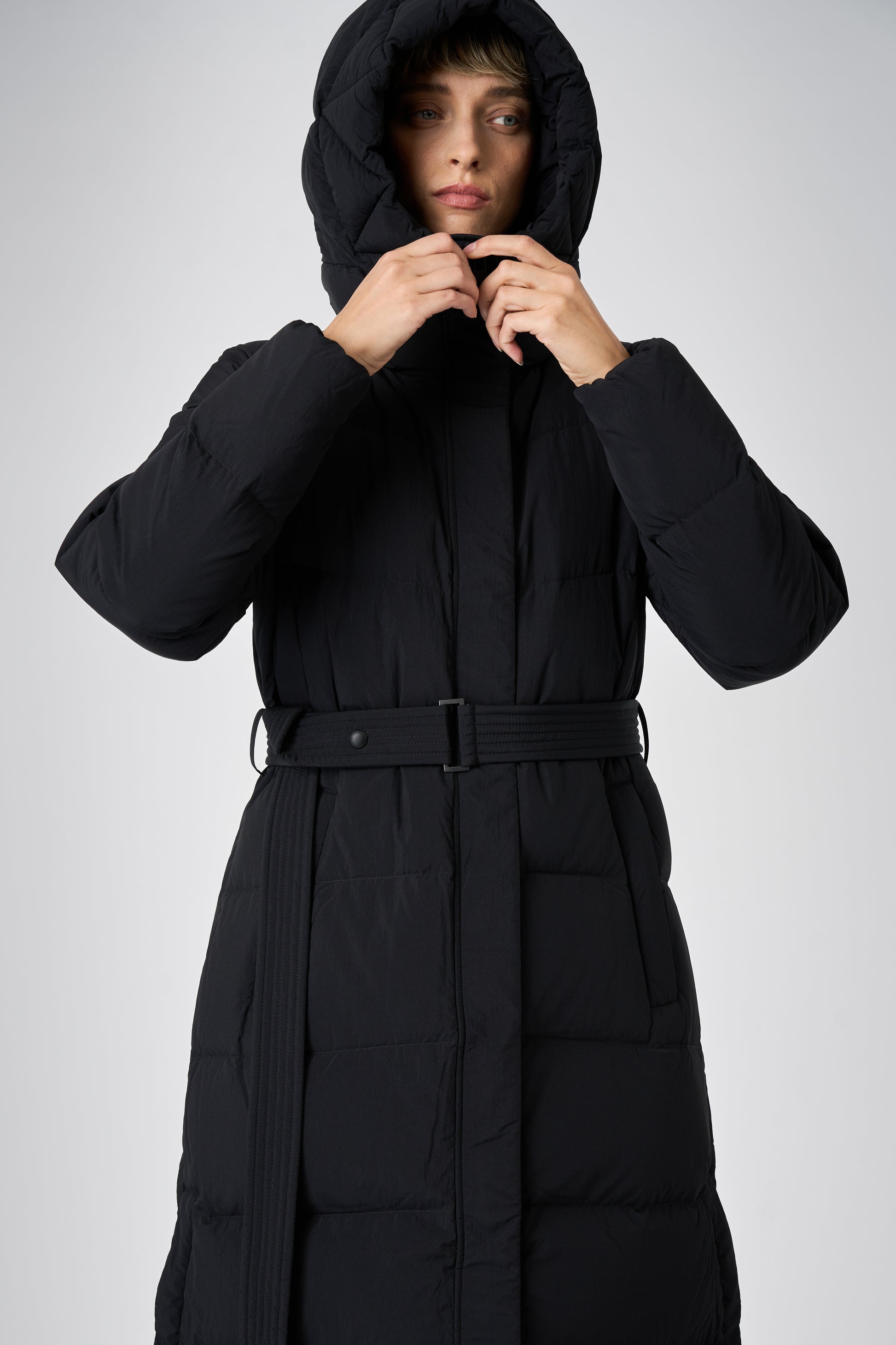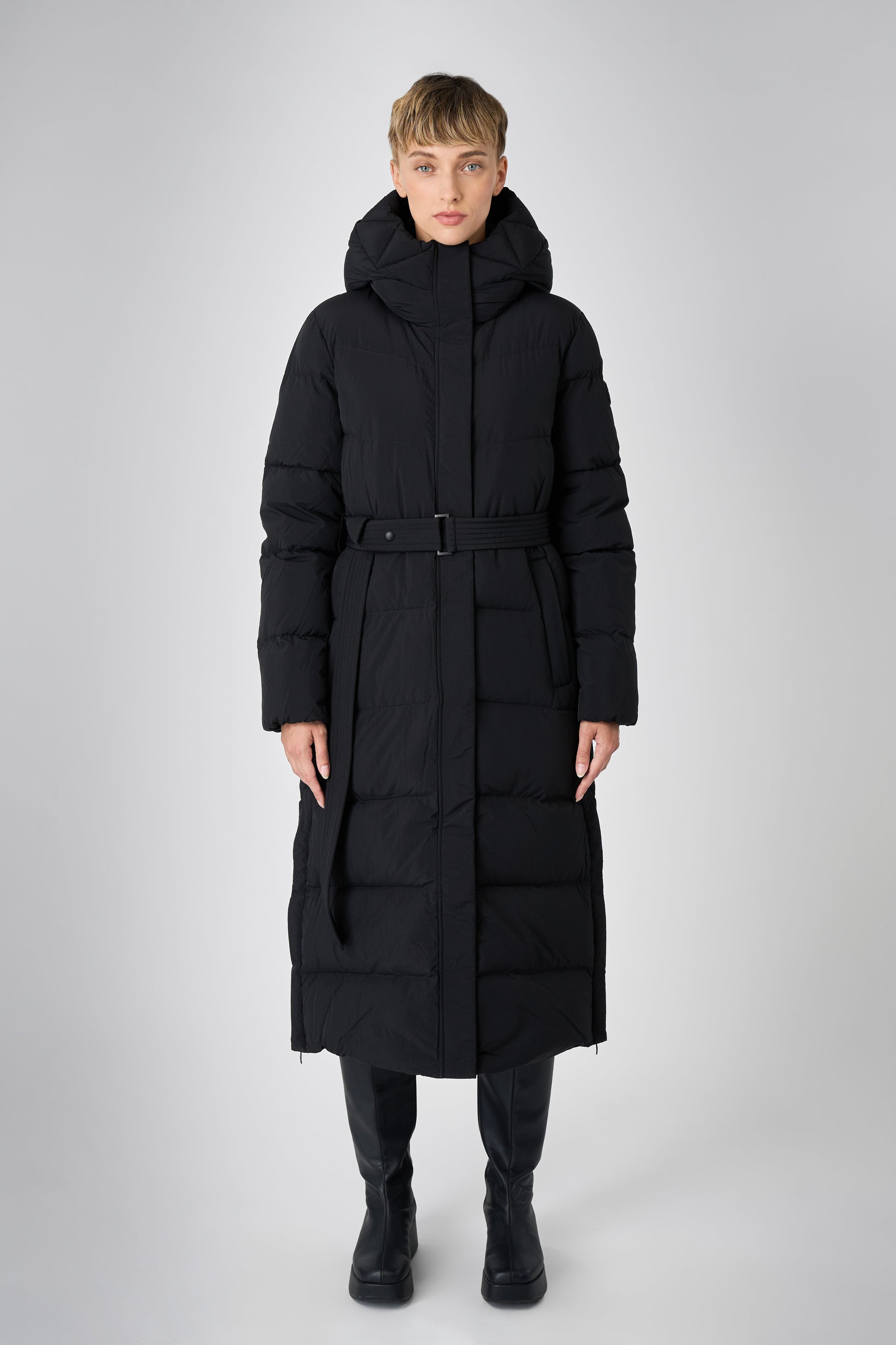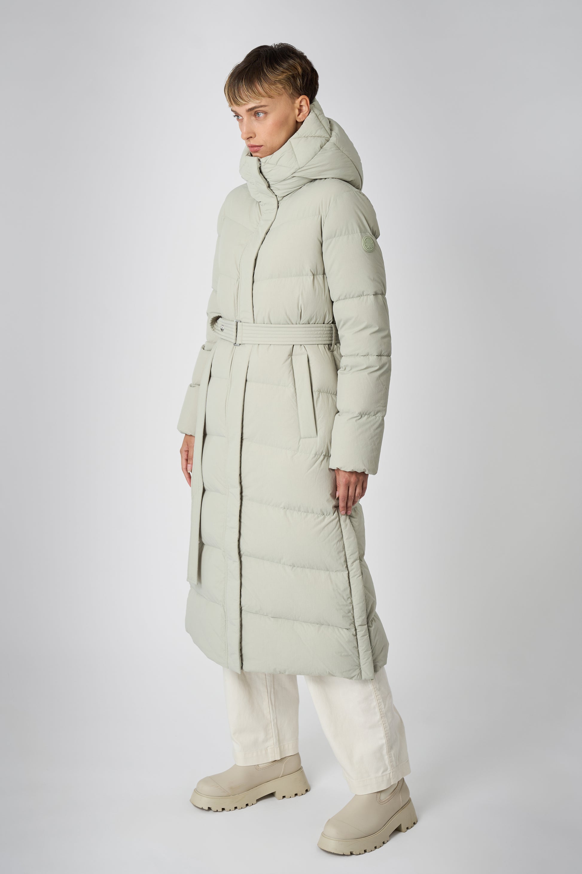 This long women's winter coat is designed for cold weather protection with repurposed down insulation for warmth in freezing temperatures. The belted silhouette and recycled materials make it both stylish and sustainable.