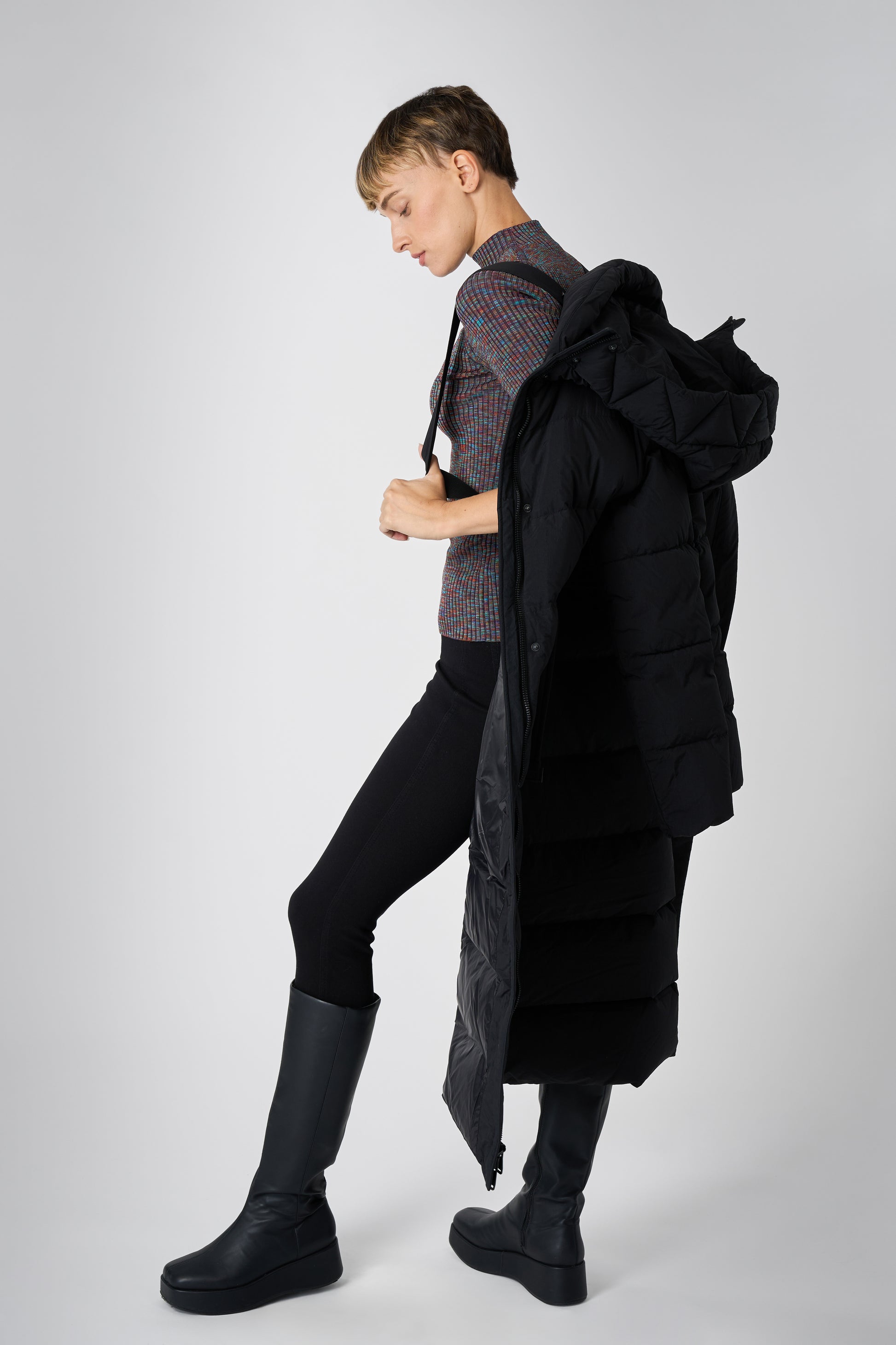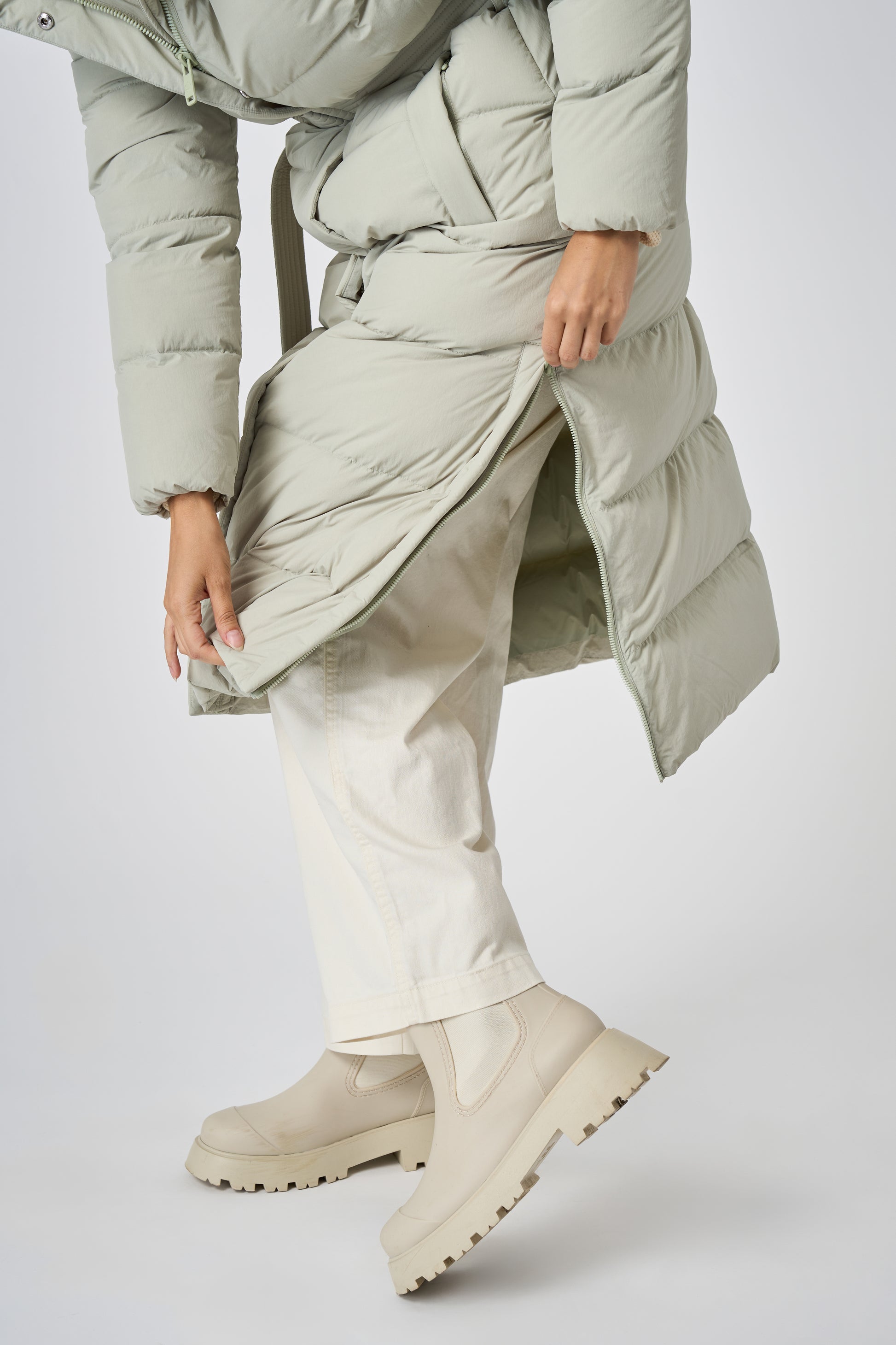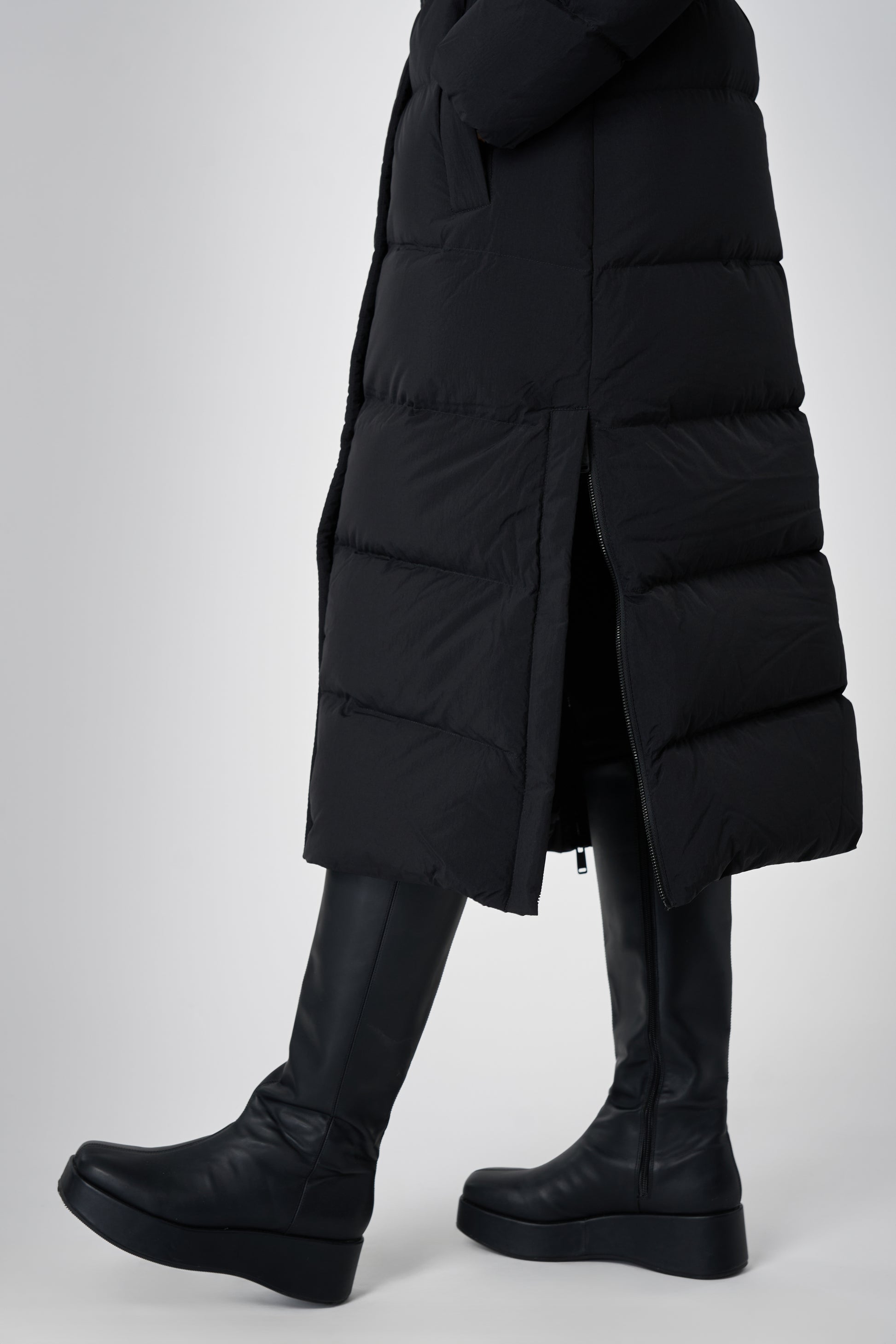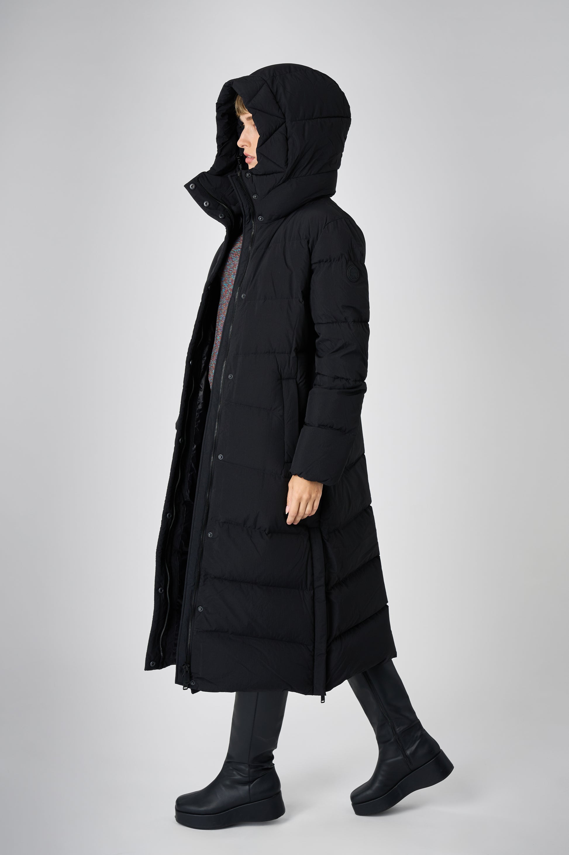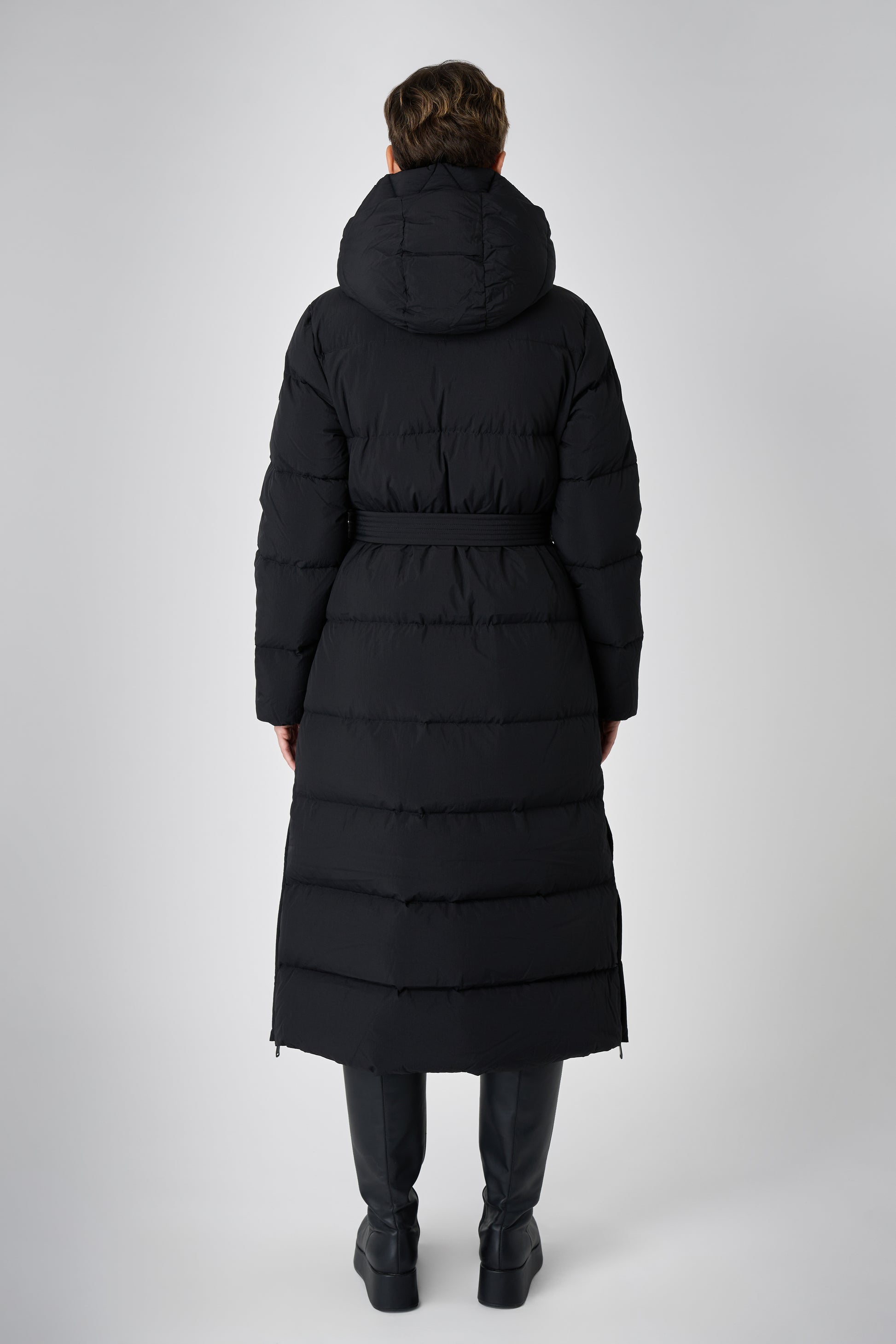 This long women's winter coat is designed for cold weather protection with repurposed down insulation for warmth in freezing temperatures. The belted silhouette and recycled materials make it both stylish and sustainable.